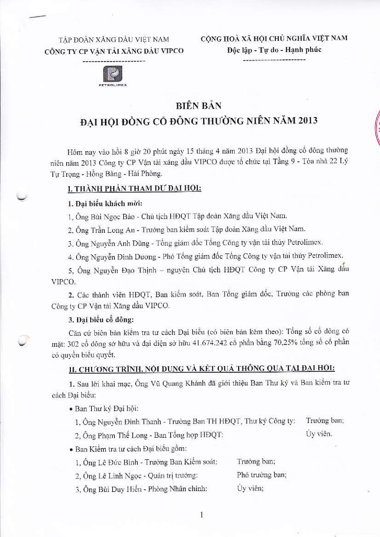 VIPCO: Biên bản họp đại hội đồng cổ đông 2013